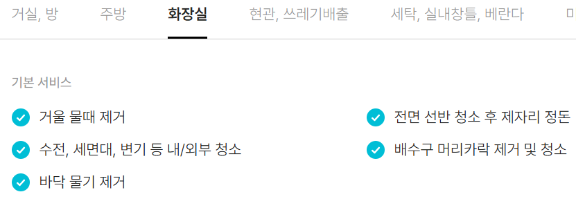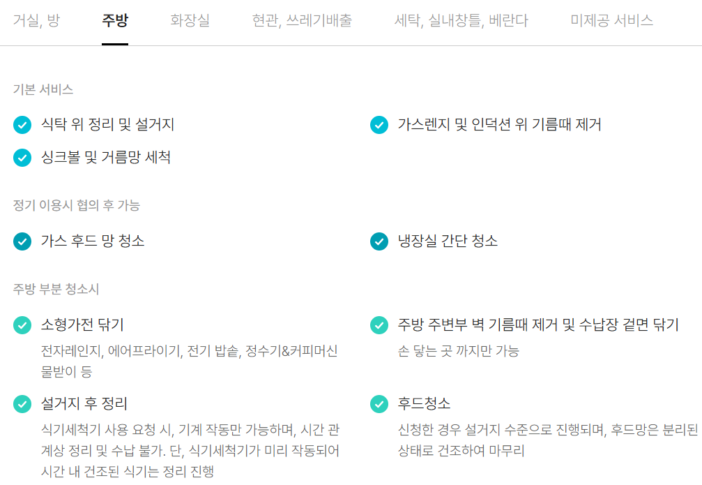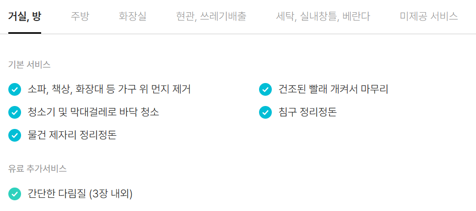 | 미제공 | 고가구 정리, 세탁물 세척, 고난이도 곰팡이 제거 등 |