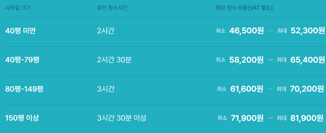 - 80~149평: 61,600원 ~ 70,200원 (3시간)