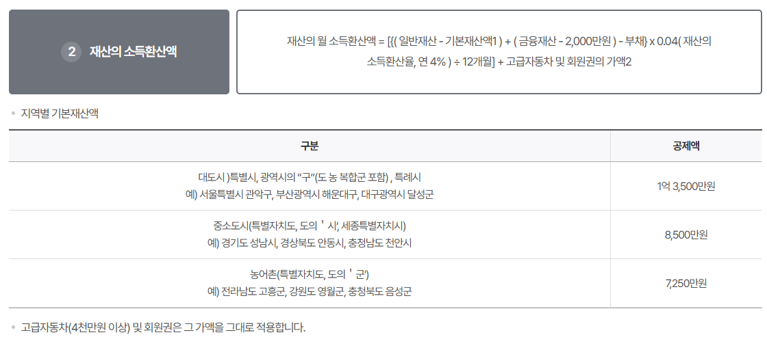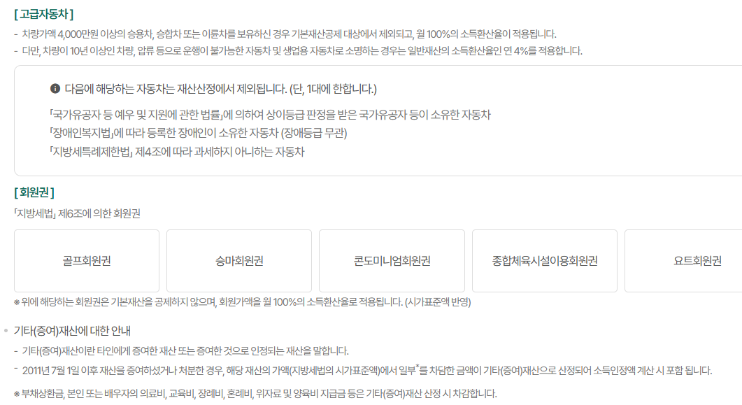 또한, 고급자동차(차량가액 4,000만 원 이상)나 고가의 회원권을 보유한 경우 해당 가액이 그대로 소득으로 환산되어 소득인정액에 포함됩니다.