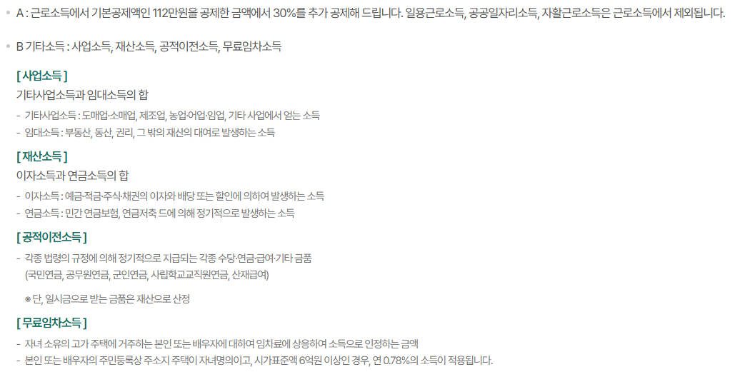 근로소득에서 기본공제액 112만 원을 공제한 후, 그 금액의 30%를 추가 공제하여 계산합니다. 일용근로소득, 공공일자리소득, 자활근로소득은 근로소득에서 제외됩니다.