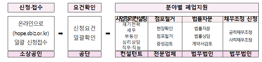 - 폐업 절차, 세무, 재기 전략, 심리 등 1:1 전문가 컨설팅